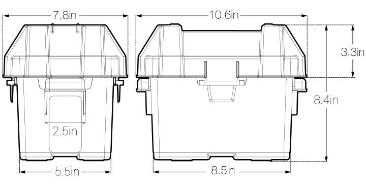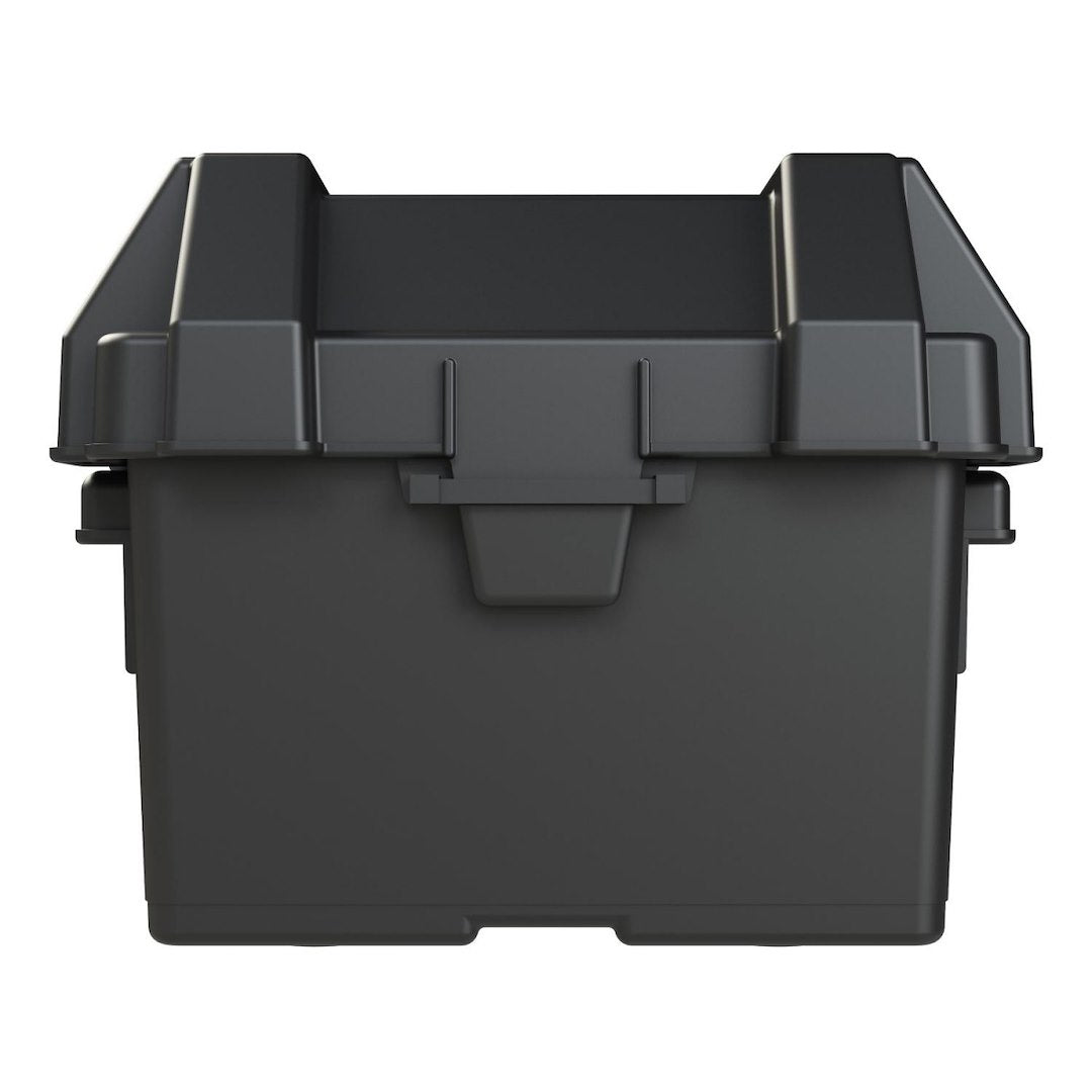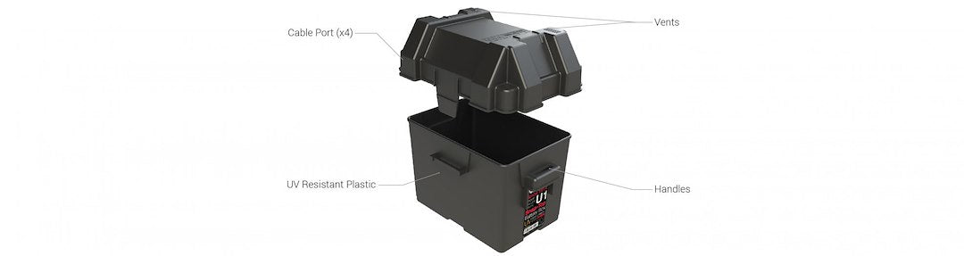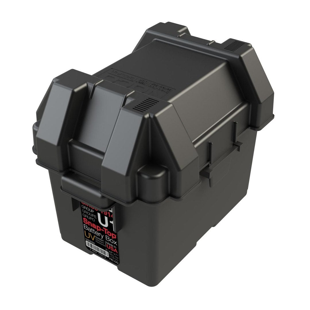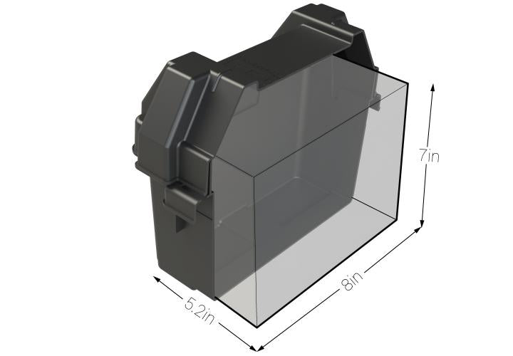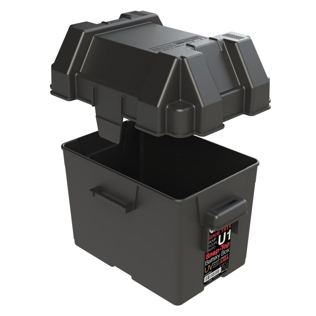 The HM082BKS Snap-Top Battery Box is a battery storage solution for sizes Group U1 Lawn and Garden, Utility and Tractor batteries. It features heavy-duty reinforced plastic handles to prevent cracking during battery relocation, and allows adequate ventilation of battery acid vapors. This rugged battery box maintains its impact properties down to minus 20 Degree Fahrenheit, as well as, resistant to UV, oil, gas and other contaminants. Perfect installation in a tractor, utility vehicle, powerchair, snow blower, or snowmobile lawn, as well as, lawn and garden and generator equipment.