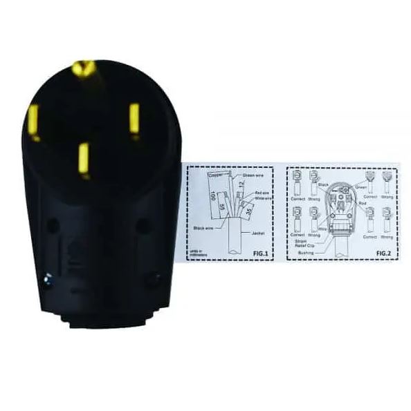 This is a direct replacement, universal 50A RV plug (male end). Model ED-507P. NEMA Type 14-50OP, rated for 125/250V 50A. This can be used as a replacement for melted, corroded or burnt ends. Are the prongs discolored or corroded or worn thin? Is the plug deformed or burnt? It may be time to replace the end. It may be time to replace the end if it is too easy to disconnect the male and female ends, or if you see any melted or burnt marks on the plug.